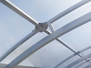 Podwójny łuk dachowy, który zapewnia nie tylko wyjątkową wytrzymałość konstrukcji, ale także trwałość przez wiele lat użytkowania. Specjalny sposób wygięcia łuków wpływa znacząco na zwiększenie wytrzymałości konstrukcji nośnej.